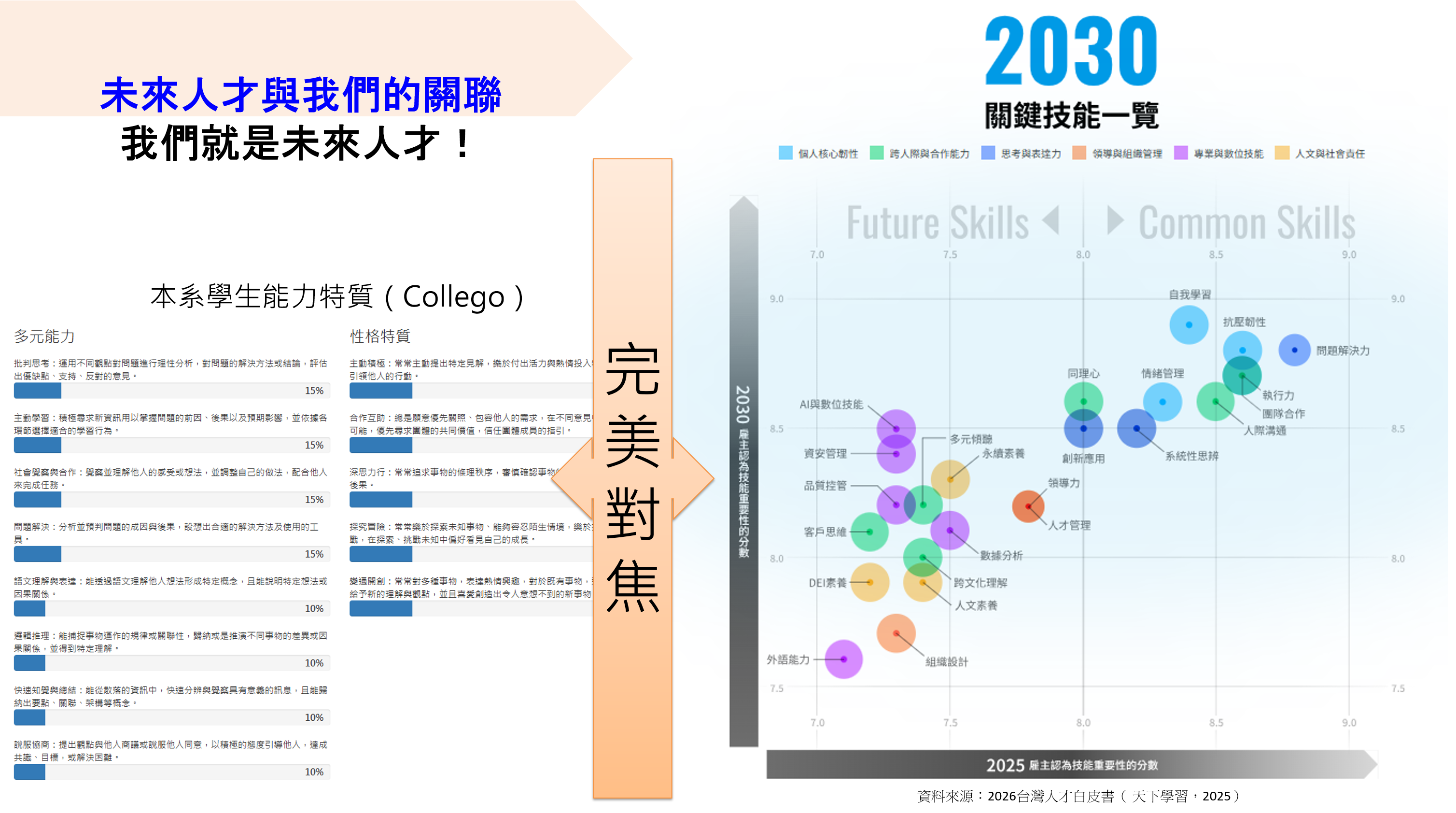 很多科系會跟你說:「自己培養未來人才」;而我們有一個很實際的證據:我們盤點過本系學生的人格特質與能力,再拿去對照天下雜誌系列「天下學習」所發布的《2026台灣人才白皮書》,有關雇主認為的2030核心能力,結果幾乎「完美對焦」;例如問題解決、系統思考、執行力、團隊合作、人際溝通、跨域整合、自我學習、面對不確定性的韌性等等,這些都是未來最看重的新技能。更重要的是,我們不只講概念,而是用政策分析、案例討論、團隊專題與實作訓練,讓你真的練得出來。簡單說:公行系不是只教你懂政府,而是把你訓練成能解決公共問題的人。