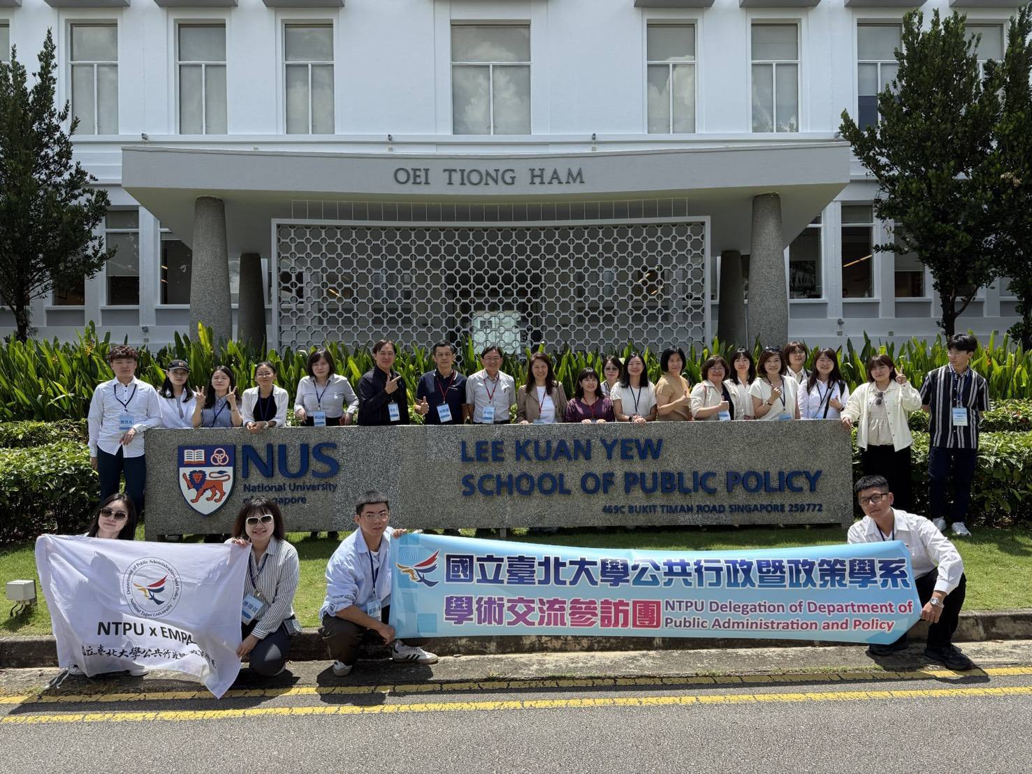 師生於是日下午赴該校的李光耀公共政策學院(Lee Kuan Yew School of Public Policy, LKYSPP)進行學生學習成果發表與交流活動,由該學院的吳木巒助理院長接待。本次共有四位來自碩士班、碩士在職專班、大學部及進修學士班的學生,以全英語發表學習成果,主題涵蓋社會住宅政策、社會企業運作、城市發展中的公民參與、台灣都市更新困境等多元面向,並與該學院來自新加坡、印度、印尼、菲律賓等國的在職學生展開跨國經驗的對話與討論。就讀LKYSPP的在職學生為來自世界各國的中高階專業文官,此次交流不僅增強學生外語發表與學術研討的專業能力,也提供跨國政策比較與實務交流的寶貴經驗。