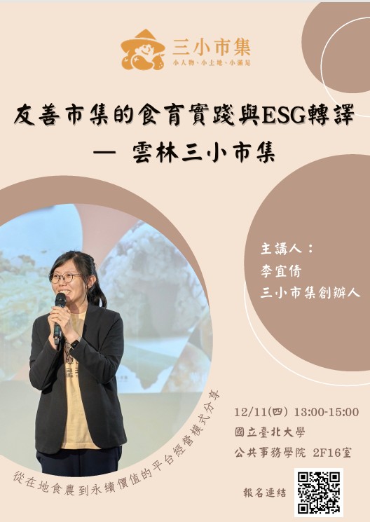 公共行政暨政策學系蔡文賢教授「社會創新商業模式」課程,特邀請「三小市集」創辦人李宜倩擔任講座,以〈友善市集的食育實踐與 ESG 轉譯——雲林三小市集〉為題,分享如何透過市集推動食育、縮短產地距離,並將永續理念落實於平台經營模式。歡迎對社會創新、永續治理與食農教育有興趣的師生參加,一同理解在地食農與永續價值的實踐方式。